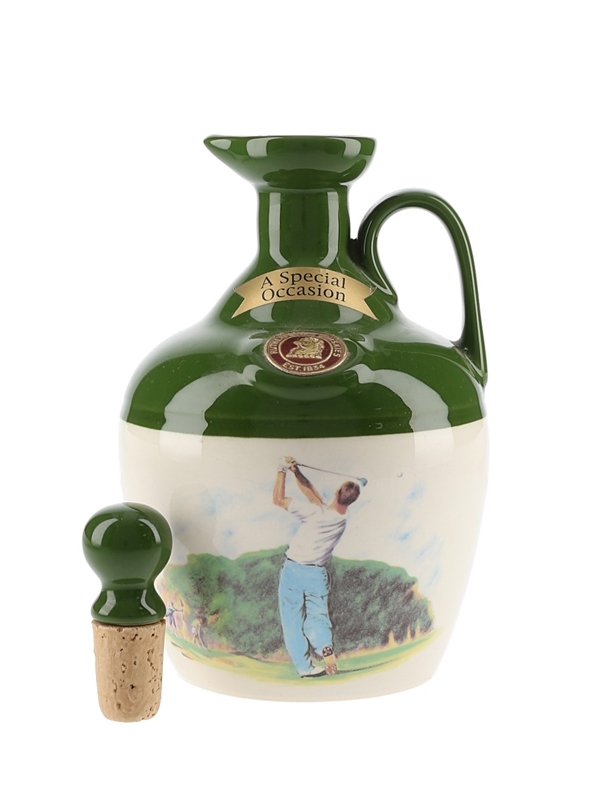 A bottle of Rutherford's blended Scotch whisky in a ceramic decanter produced by Montrose Pottery.