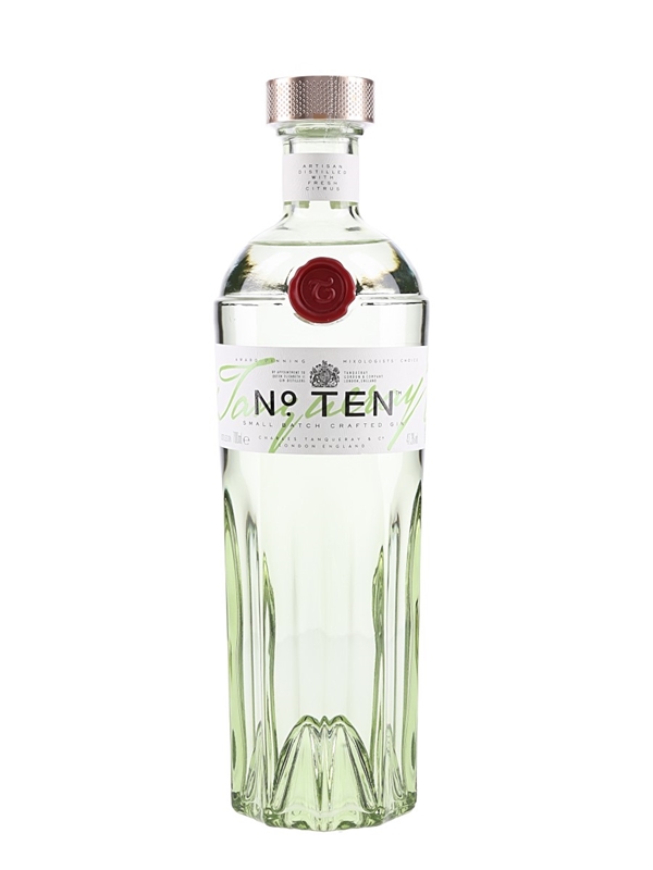 A bottle of Tanqueray No.Ten small batch gin. This was named after the No. 10 still in which it was made. This was produced in Britain for Charles Tanqueray & Co. Lakeside Drive, Park Royal, London.