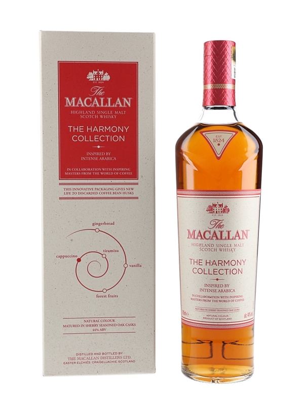 A bottle of The Macallan Intense Arabica Highland Single Malt Scotch Whisky from The Harmony Collection. This is inspired by the Ethiopian Arabica bean, in collaboration with inspiring masters from around the world of coffee.