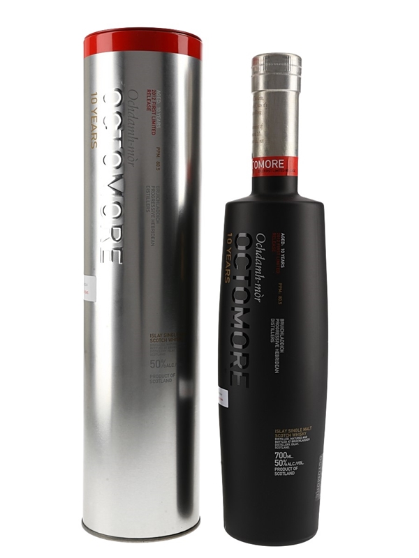 A bottle of Octomore 10 Year Old Islay Single Malt Scotch Whisky. This was the oldest edition of Bruichladdich's super-peaty malt released in 2012.