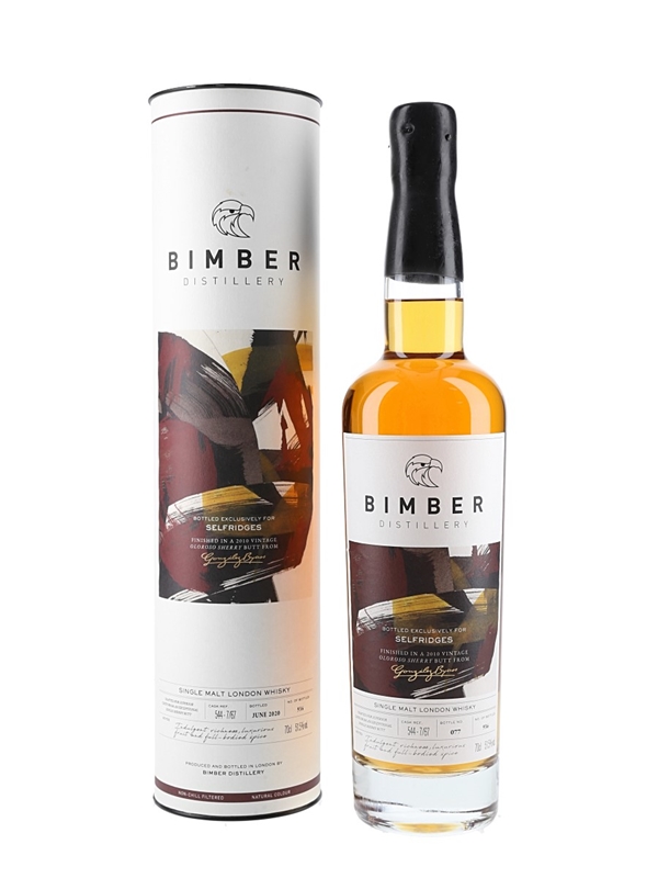 A bottle of Bimber Distillery Single Malt London Whisky. This was finished in a 2010 vintage oloroso sherry butt from Gonzalez Byass and exclusively bottled for Selfridges in June 2020.