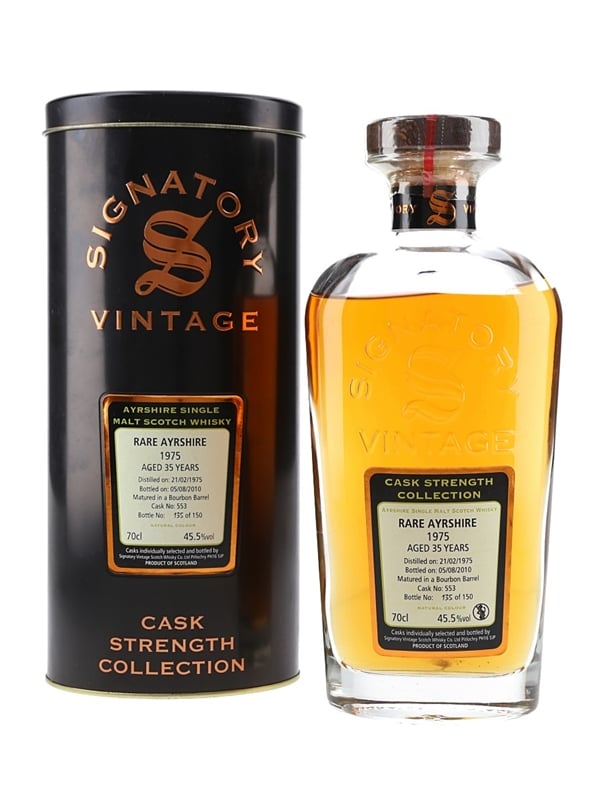 A bottle of Rare Ayrshire (Ladyburn) 35 Year Old Single Malt Scotch Whisky. This was distilled on 21 February 1975, matured in a Bourbon Barrel and bottled at 45.5% ABV on 5 August 2010 by Signatory for the Cask Strengh Collection.