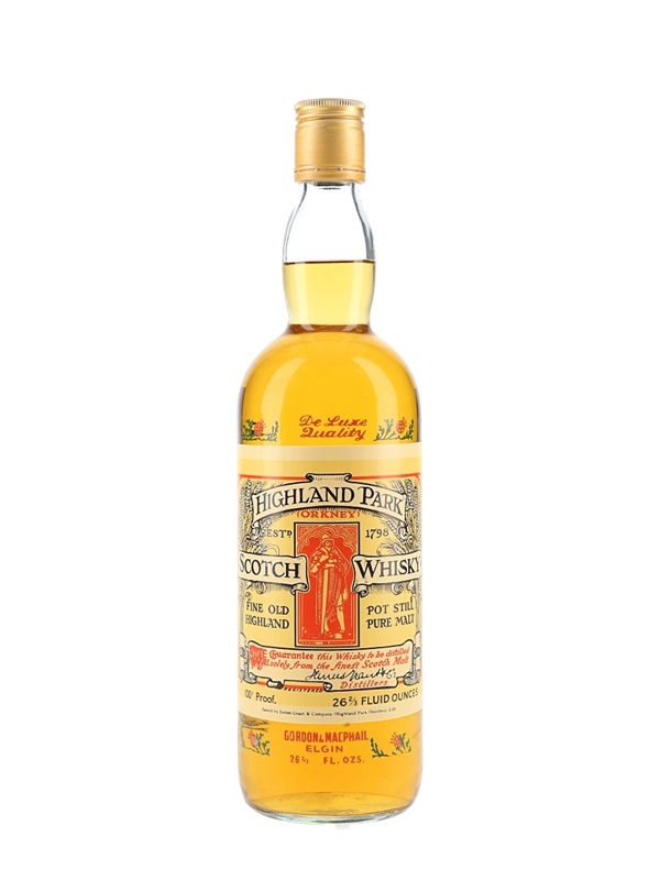 A bottle of Highland Park 100 Proof Fine Old Pot Still Highland Pure Malt, issued by James Grant & Company. We estimate this was bottled in the late 1960s to early 1970s.