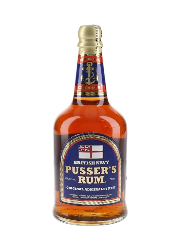 A bottle of Pusser's British Navy Rum, produce of Guyana, Trinidad, and the British Virgin Islands. This was imported to the UK by Cellar Trends.