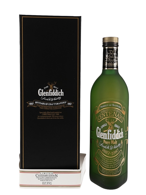 A bottle of Glenfiddich Pure Malt Scotch Whisky, bottled on Christmas Day 1986 and released in 1987 to celebrate the distillery's 100th anniversary. This comes in a presentation box with a certificate of authenticity.
