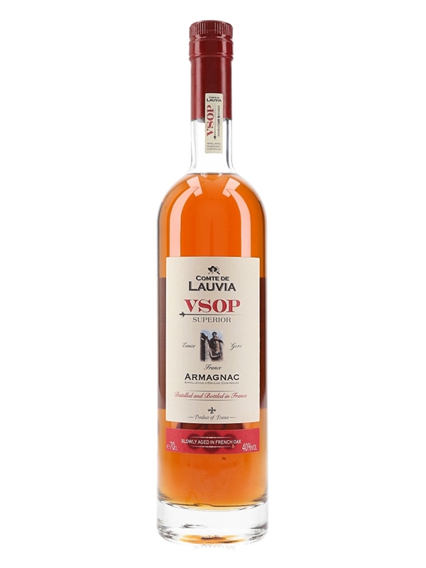 A bottle of VSOP Superior Armagnac produced by Comte De Lauvia. Matured slowly in French Oak for at least Four Years.
