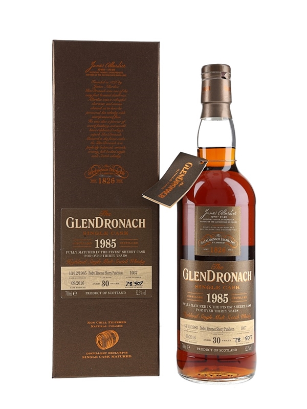 A bottle of Glendronach 30 Year Old Single Malt Scotch Whisky. This was distilled in 1985 and matured in a single Pedro Ximenez sherry puncheon before bottling in 2016.