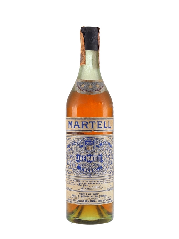 A bottle of Martell 3 Star Very Old Pale Cognac, sealed with a spring cap closure. We estimate this was bottled in the early 1950s and imported to the Italian market by Ditta Carlo Salengo