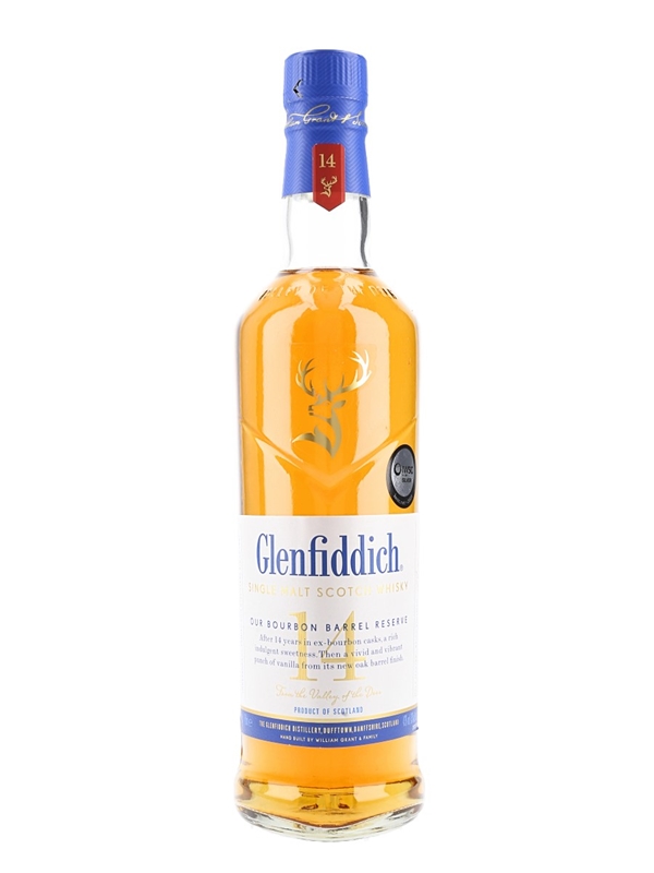 A bottle of Glenfiddich 14 Year Old Bourbon Barrel Reserve Single Malt Scotch Whisky, matured in ex-bourbon casks and bottled at 43% ABV.