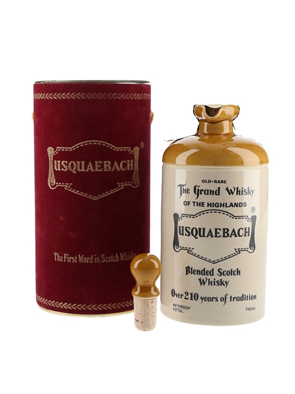 A bottle of Usquaebach Old Rare Blended Scotch Whisky presented in a stoneware flagon. This was blended and bottled by Douglas Laing & Co. Ltd. for Twelve Stone Flagons, USA. We estimate this was bottled in the 1970s to 1980s.