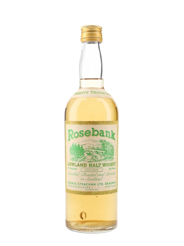 A bottle of Rosebank 20 Year Old Single Lowland Malt Scotch Whisky, specially bottled in Scotland for grocer George Strachan, we estimate in the 1970s.