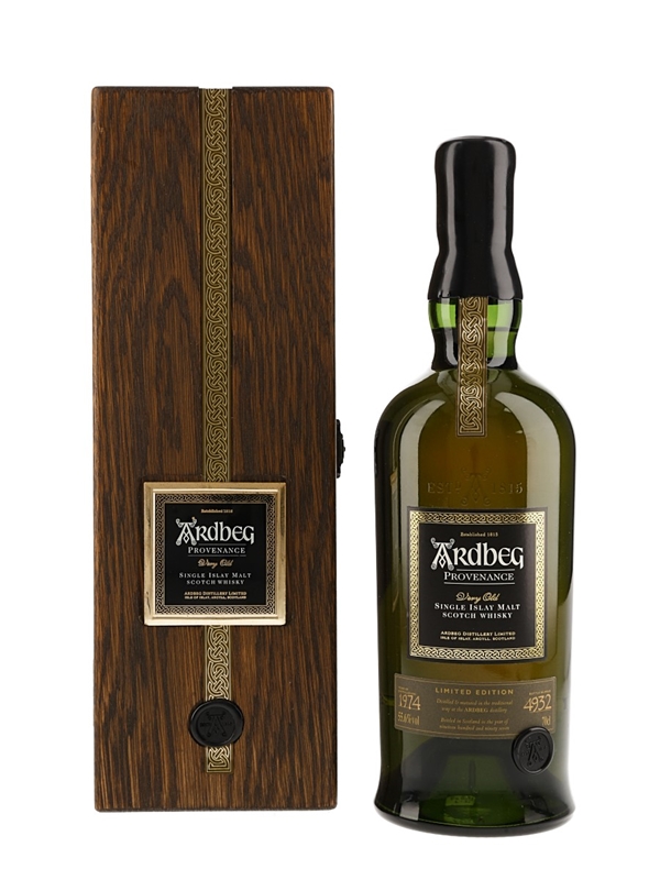 A bottle of Ardbeg Provenance Very Old Single Islay Malt Scotch Whisky. This was distilled in 1974, one of the last years that Ardbeg's maltings were fully operational, and bottled on 18 November 1997 at cask strength of 55.6% ABV.