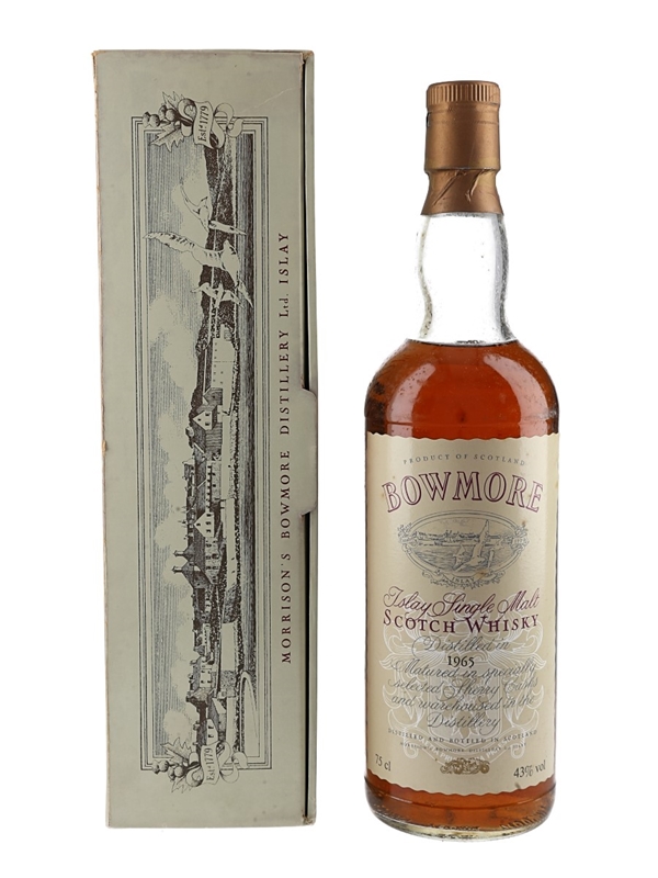 A bottle of Bowmore 1965 Islay Single Malt Scotch Whisky. This was distilled in 1965, matured in sherry casks and bottled at 43% ABV. We estimate this was bottled in the 1980s.