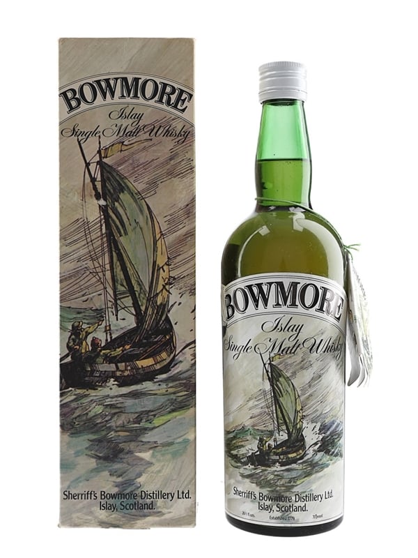 A bottle of Bowmore Islay Single Malt, we estimate this was bottled in the 1970s by Sherriff's Bowmore Distillery Ltd.