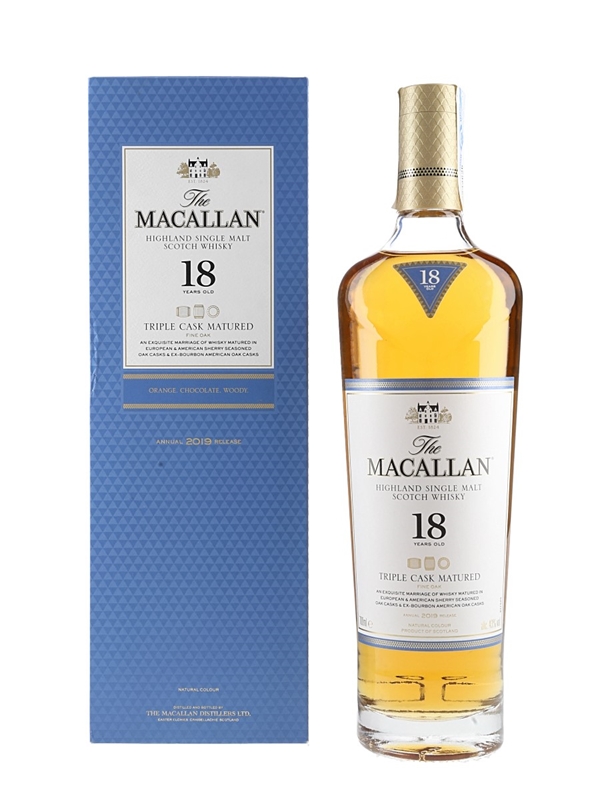 A bottle of The Macallan 18 Year Old Triple Cask Matured Highland Single Malt Scotch Whisky from the Fine Oak range. This is a marriage of whisky matured in European and American Sherry seasoned casks and ex-bourbon American casks.