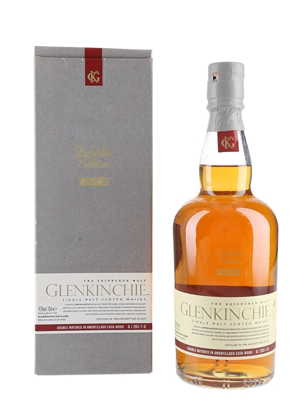 A limited edition bottle of Glenkinchie Single Malt Scotch Whisky. This was distilled in 1996, double matured in Amontillado casks and bottled at 43% ABV in 2010 for the Distillers Edition range.
