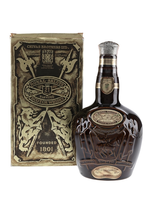 A bottle of Royal Salute 21 Year Old, presented in a brown Spode decanter. We estimate this was bottled in the 1970s.