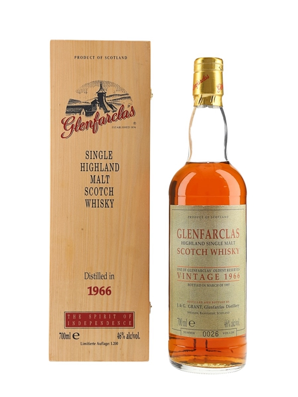 A bottle of Glenfarclas 1966 Highland Single Malt Scotch Whisky. This was distilled in 1966 and bottled in March 1997 for the German market as part of The Spirit Of Independence range, produced by J.G. Grant.