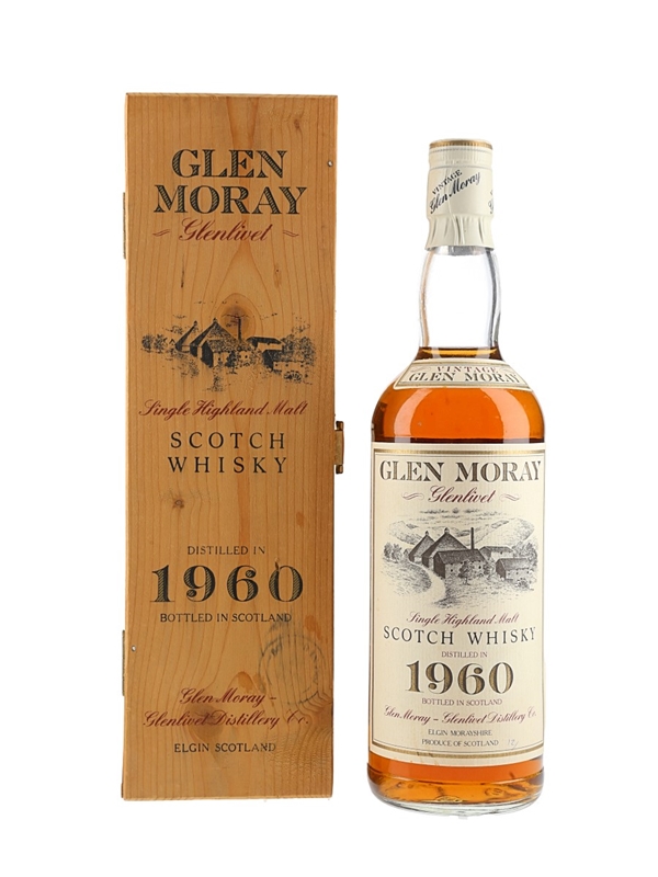 A bottle of Glen Moray Glenlivet 24 Year Old Single Highland Malt Scotch Whisky. This was distilled in 1960, matured in oak casks for 26 years and bottled in the 1980s.