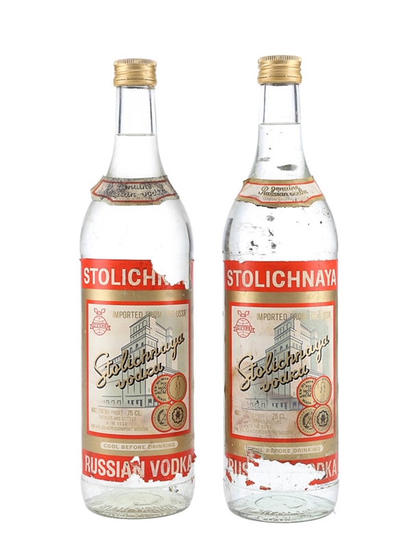 This lot contains two bottles of Stolichnaya Russian Vodka. These were distilled and bottled in the USSR, we estimate in the 1970s. Today, Stolichnaya is produced in Latvia.