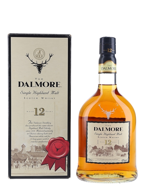 A bottle of Dalmore 12 Year Old Single Highland Malt Scotch Whisky, matured in American white oak and oloroso sherry wood. We estimate this was bottled in the 1990s to 2000s.