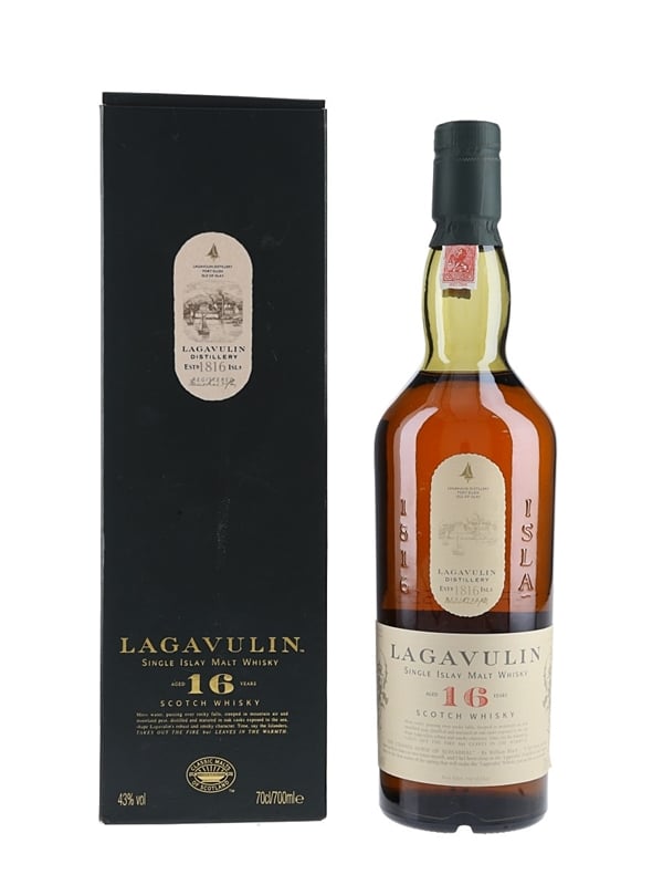 A bottle of Lagavulin 16 Year Old Single Islay Malt Scotch Whisky, part of Diageo's Classic Malts of Scotland range.
