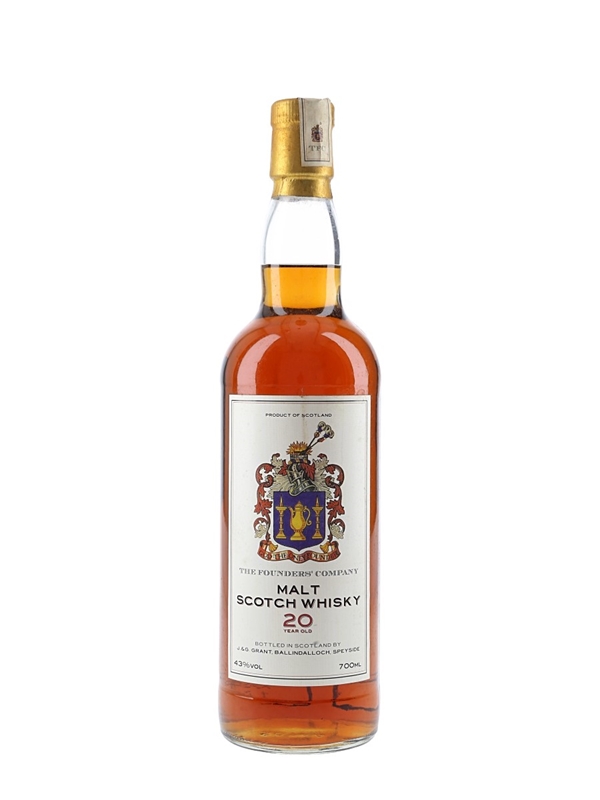 A bottle of The Founder's Company 20 Year Old Malt Scotch Whisky, bottled by J & G Grant, Ballindalloch, Speyside. We estimate this was bottled in the 1990s.