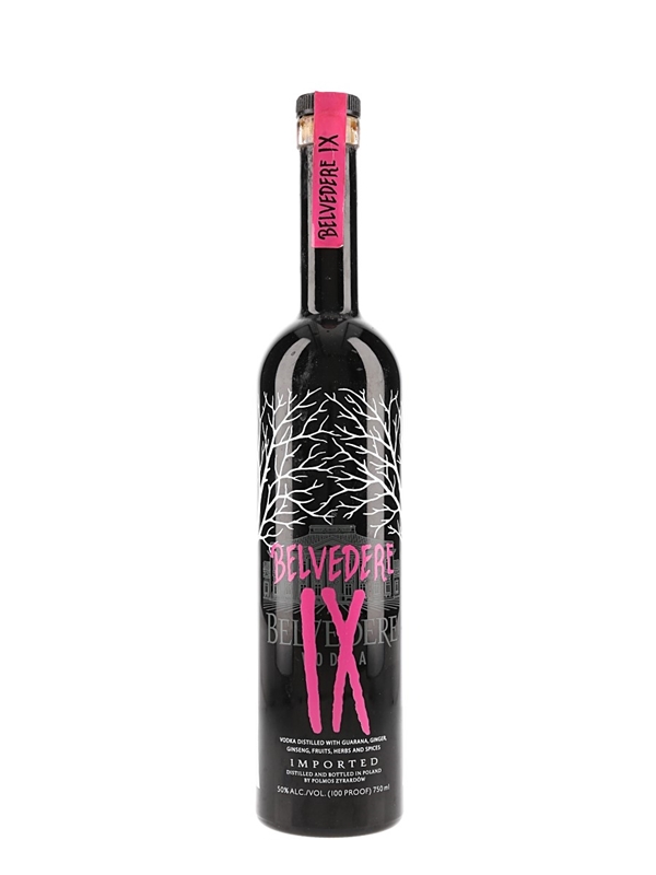 A bottle of Belvedere IX, Vodka distilled with Guarana, Ginger, Ginseng, Fruits, Herbs and Spices. Bottled in Poland by Polmos Żyrardów.