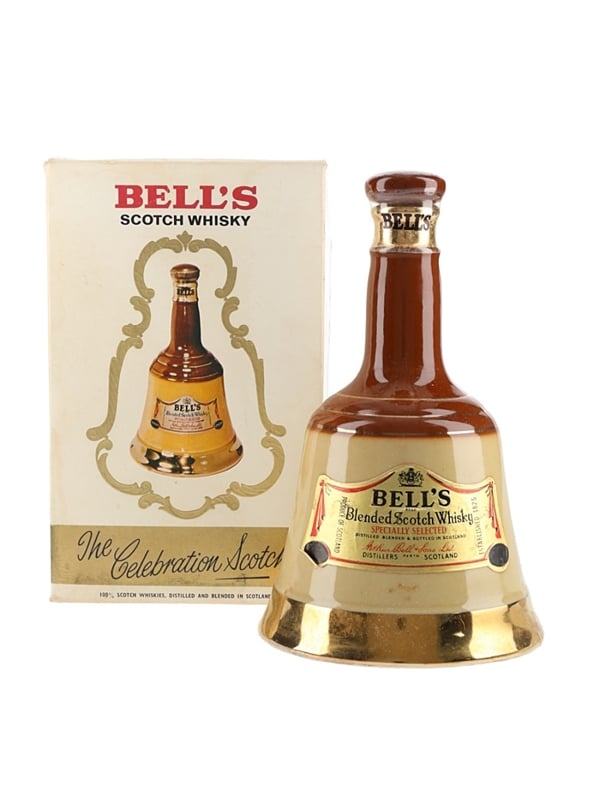 A 37.5cl bottle of Bell's Specially Selected Blended Scotch Whisky produced by Arthur Bell & Sons Ltd. and presented in a old style brown ceramic Wade decanter. This preceded the Christmas series and is of a slightly narrower shape than later editions. This was bottled Duty Free, we estimate this was bottled in the 1980s.