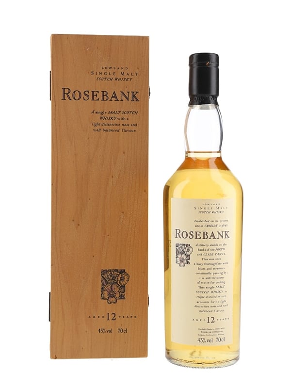 A bottle of Rosebank 12 Year Old Lowland Single Malt Scotch Whisky, bottled for Diageo's Flora & Fauna collection.