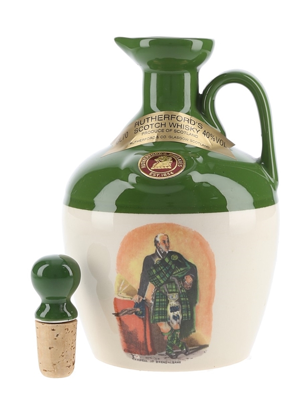 A bottle of Rutherford's Blended Scotch Whisky in a ceramic decanter, we estimate this was bottled in the 1980s.