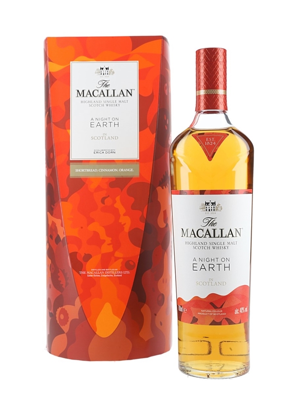 A limited edition bottle of The Macallan A Night On Earth in Scotland Highland Single Malt Scotch Whisky, celebrating the joy of New Year's Eve, known in Scotland as Hogmanay. This was aged in European and American sherry seasoned oak casks and ex-bourbon American oak casks. The packaging was designed by Japanese-French illustrator Erica Dorn.