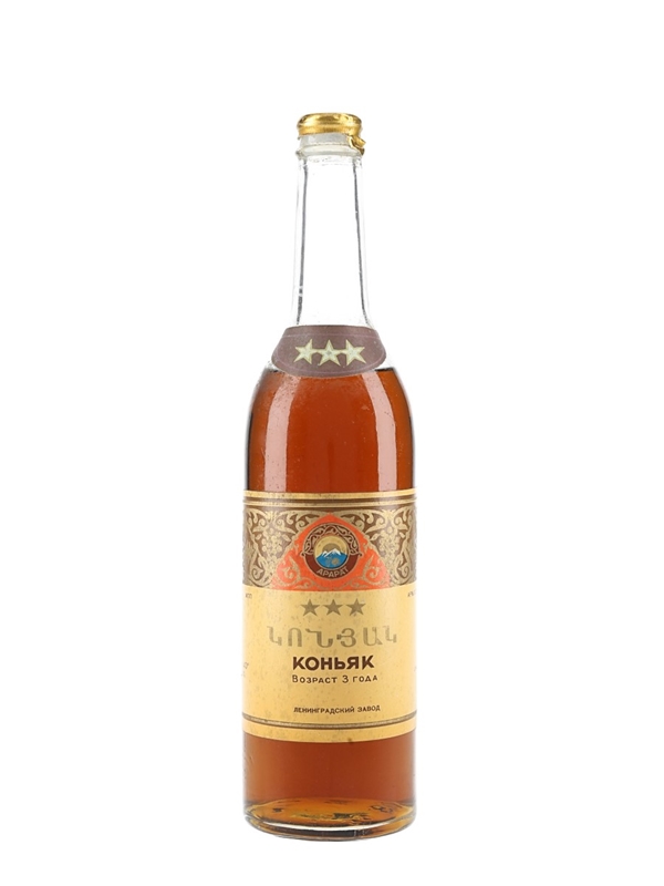A bottle of 3 Star 3 Year Old Armenian brandy, by Ararat Distillery, Yerevan.