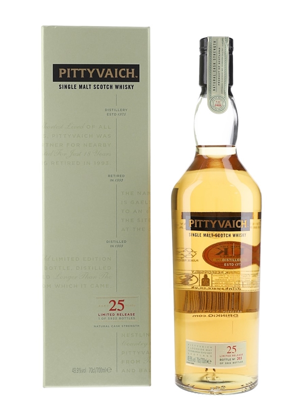 A bottle of Pittyvaich 25 Year Old Single Malt Scotch Whisky. This was distilled in 1989 and bottled at natural cask strength in 2015 for Diageo's Special Releases.