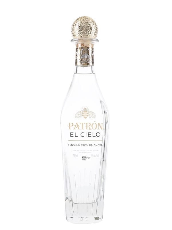 A bottle of Patron El Cielo Silver Tequila. This is made from 100% Weber blue agave, and distilled four times before bottling.