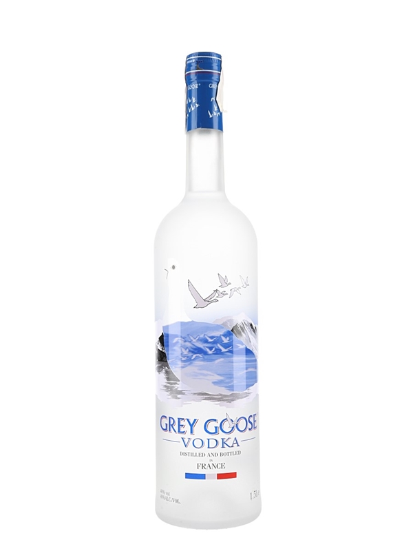 A 1.5 litre bottle of Grey Goose Vodka, distilled and bottled in France.