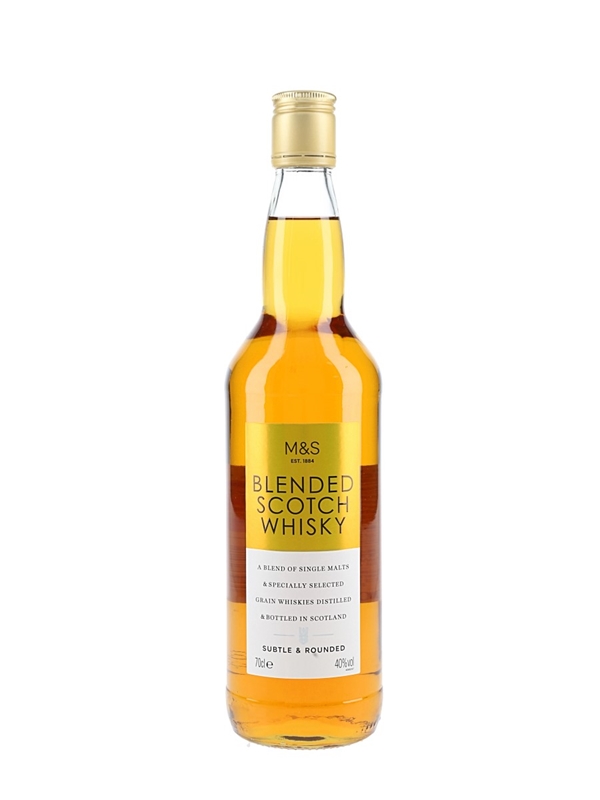 A bottle of M&S Blended Scotch Whisky. A blend of single malts & specially selected grain whiskies, distilled & bottled in Scotland.