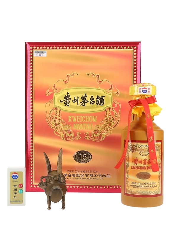 A 50cl bottle of Kweichow Moutai 15 Year Old baijiu, presented with a metal cup. The bottling code indicates this was bottled in 2024.