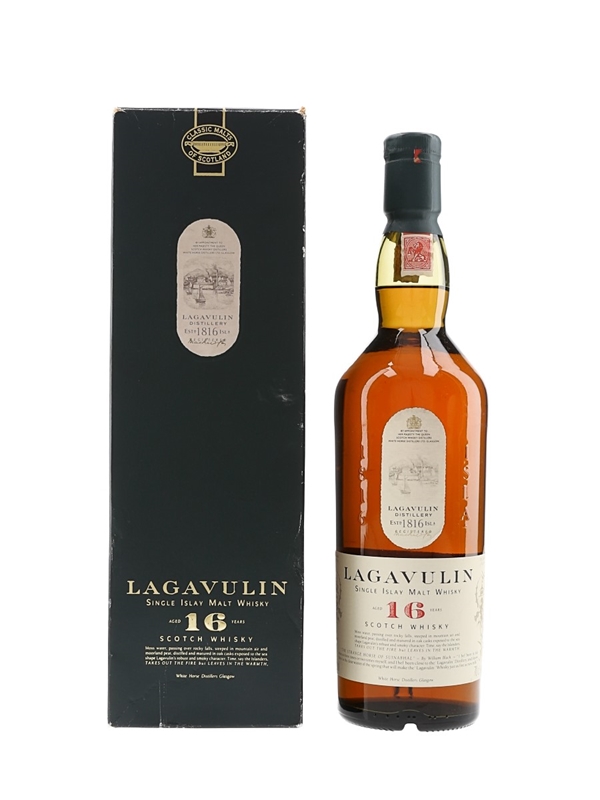 A bottle of Lagavulin 16 Year Old Single Islay Malt Scotch Whisky, part of Diageo's Classic Malts of Scotland range. We estimate this was bottled in the 1990s, when the distillery was still owned by White Horse Distillers.