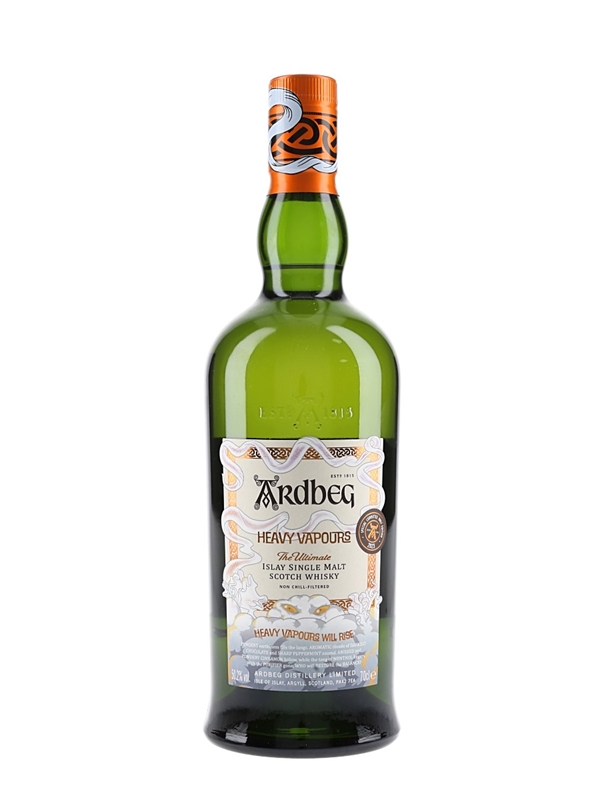 A bottle of Ardbeg Heavy Vapours The Ultimate Islay Single Malt Scotch Whisky distilled without a purifier. This Ardbeg Committee Only Edition was bottled at 50.2% ABV in 2023.