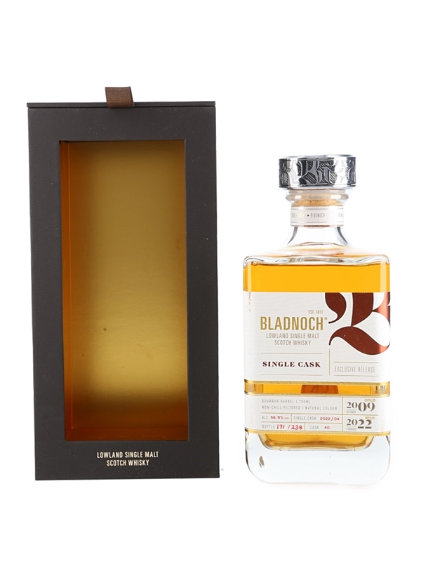 A bottle of Bladnoch Single Cask Exclusive Release Lowland Single Malt Scotch Whisky. This was distilled in October 2009, matured in a single Bourbon cask and bottled in February 2022 at a cask strength of 56.9% ABV.