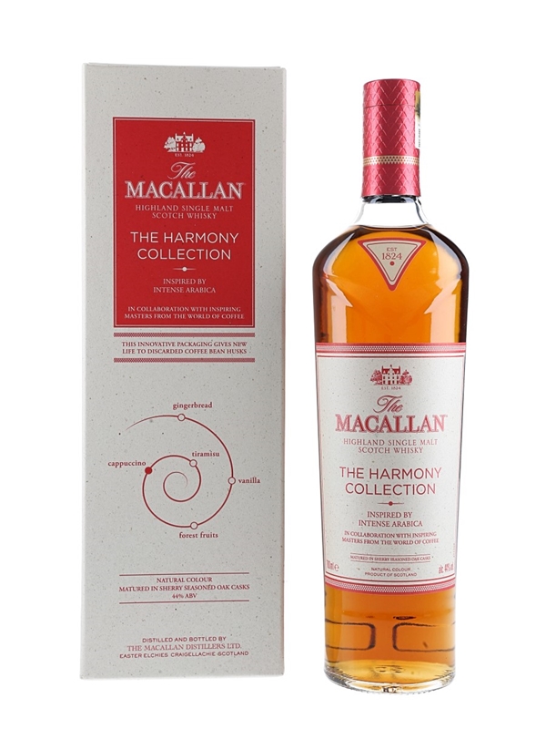A bottle of The Macallan Intense Arabica Highland Single Malt Scotch Whisky from The Harmony Collection. This is inspired by the Ethiopian Arabica bean, in collaboration with inspiring masters from around the world of coffee.