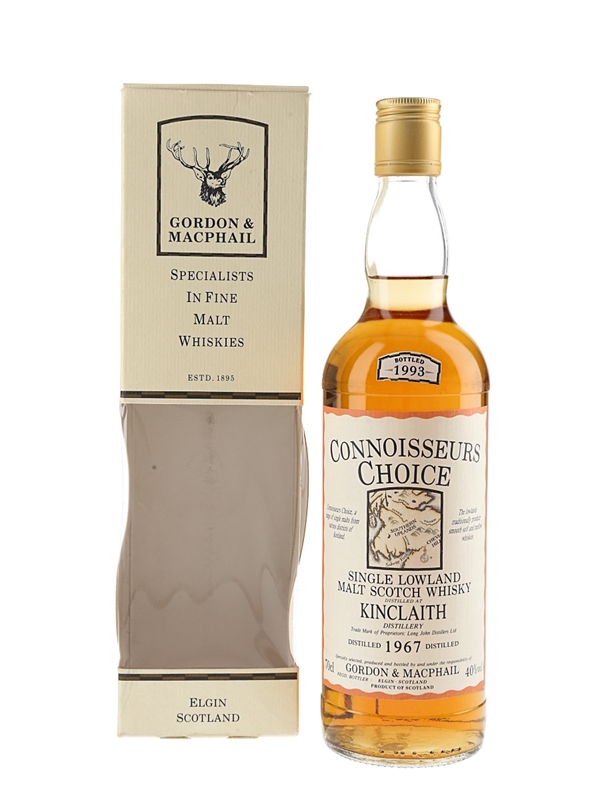 A bottle of Kinclaith Single Lowland Malt Scotch Whisky. This was distilled in 1967 and bottled in 1993 by Gordon & MacPhail as part of the Connoisseurs Choice series.
