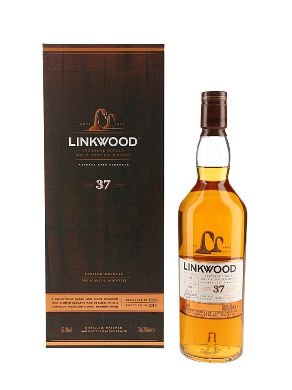 A bottle of Linkwood 37 Year Old Single Malt Scotch Whisky. This was distilled in 1978 and bottled at natural cask strength in 2016 for Diageo's Special Releases.
