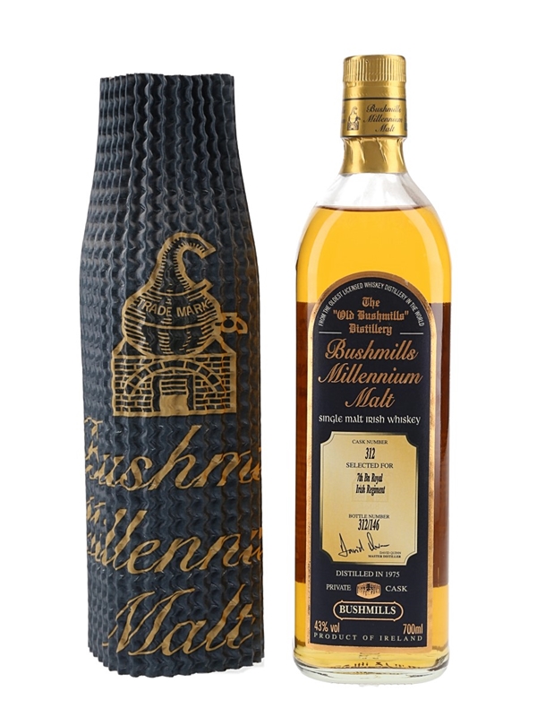 A bottle of Bushmills Millennium Single Malt Irish Whiskey. This was distilled in 1975 and bottled from a private cask selected for 7th Bn Royal Irish Regiment.