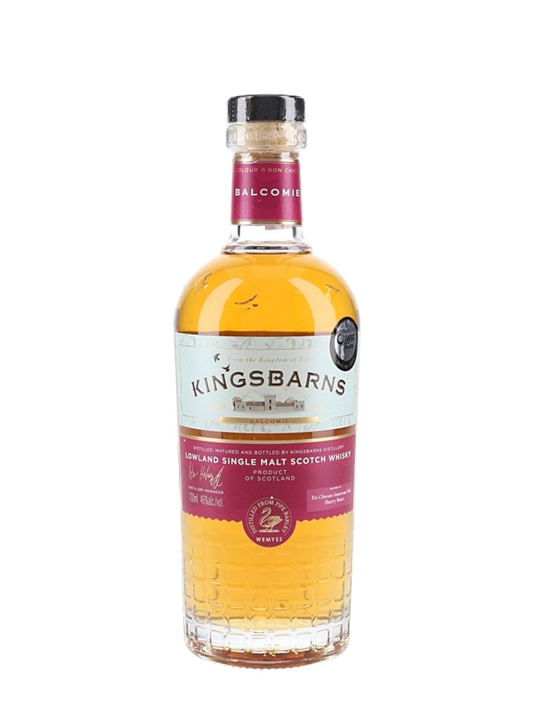 A bottle of Kingsbarns Balcomie Single Malt Scotch Whisky matured in first fill Ex-Oloroso American Oak & Sherry Butts.