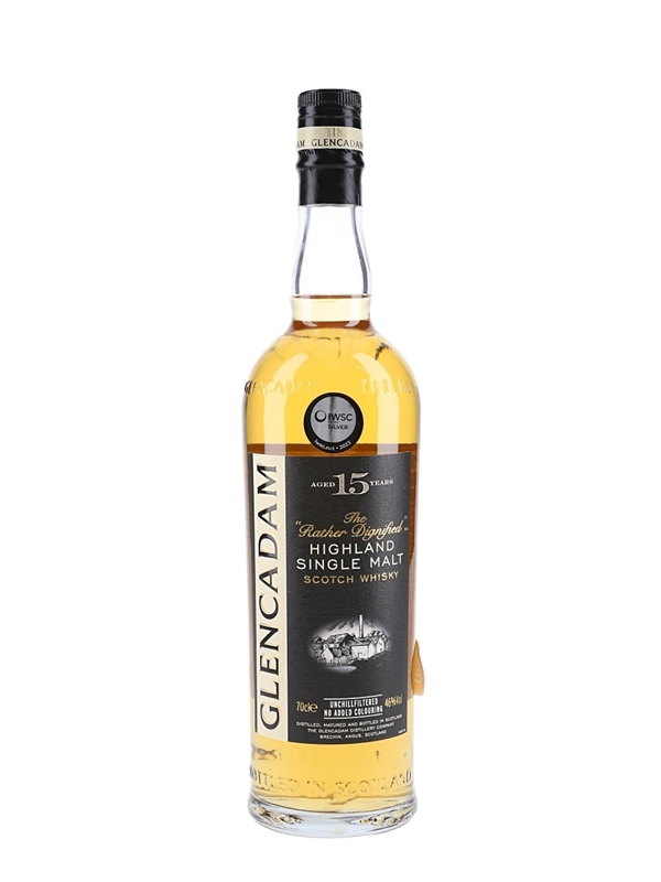A bottle of Glencadam 15 Year Old, 'The Rather Dignified' Highland Single Malt Scotch Whisky. The bottling code indicates this was bottled in 2022.