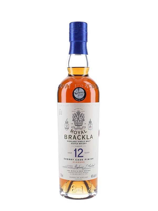 A bottle of Royal Brackla 12 Year Old Highland Single Malt Scotch Whisky, finished in Oloroso sherry casks.