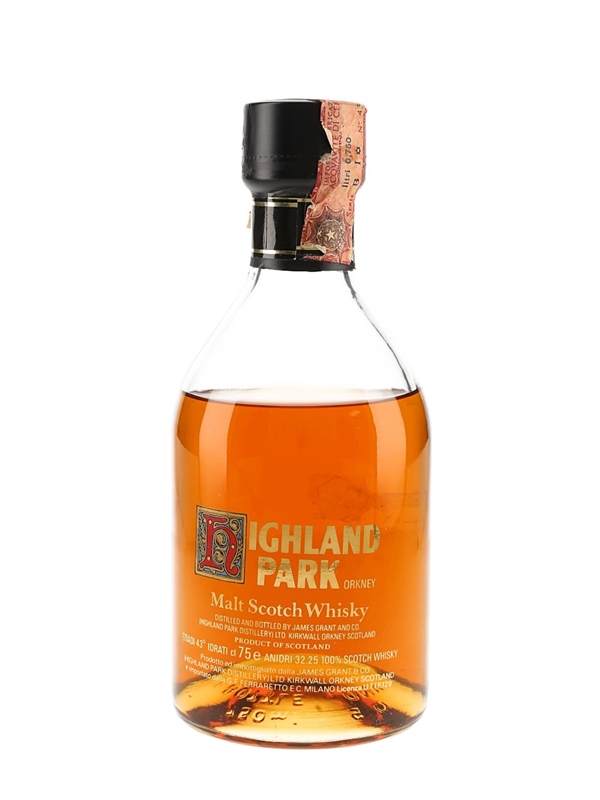A bottle of Highland Park 12 Year Old Single Malt Scotch Whisky from Orkney, distilled and bottled by James Grant and Co and imported to the Italian market by G.F. Ferraretto. We estimate this was bottled in the 1980s.
