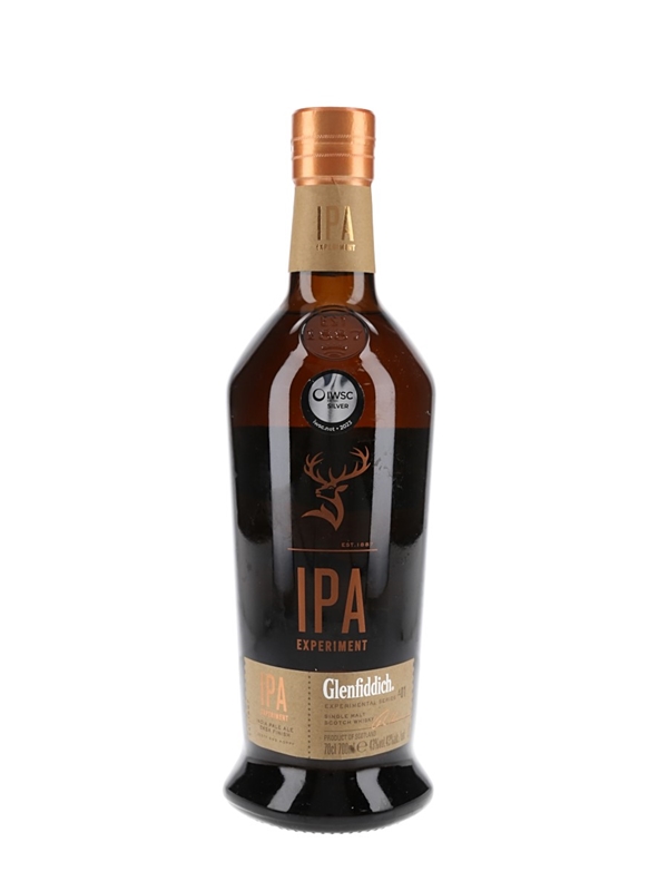 A bottle of Glenfiddich IPA Single Malt Scotch Whisky, the first release in the distillery's Experimental series. This was finished in India Pale Ale craft beer casks before bottling.